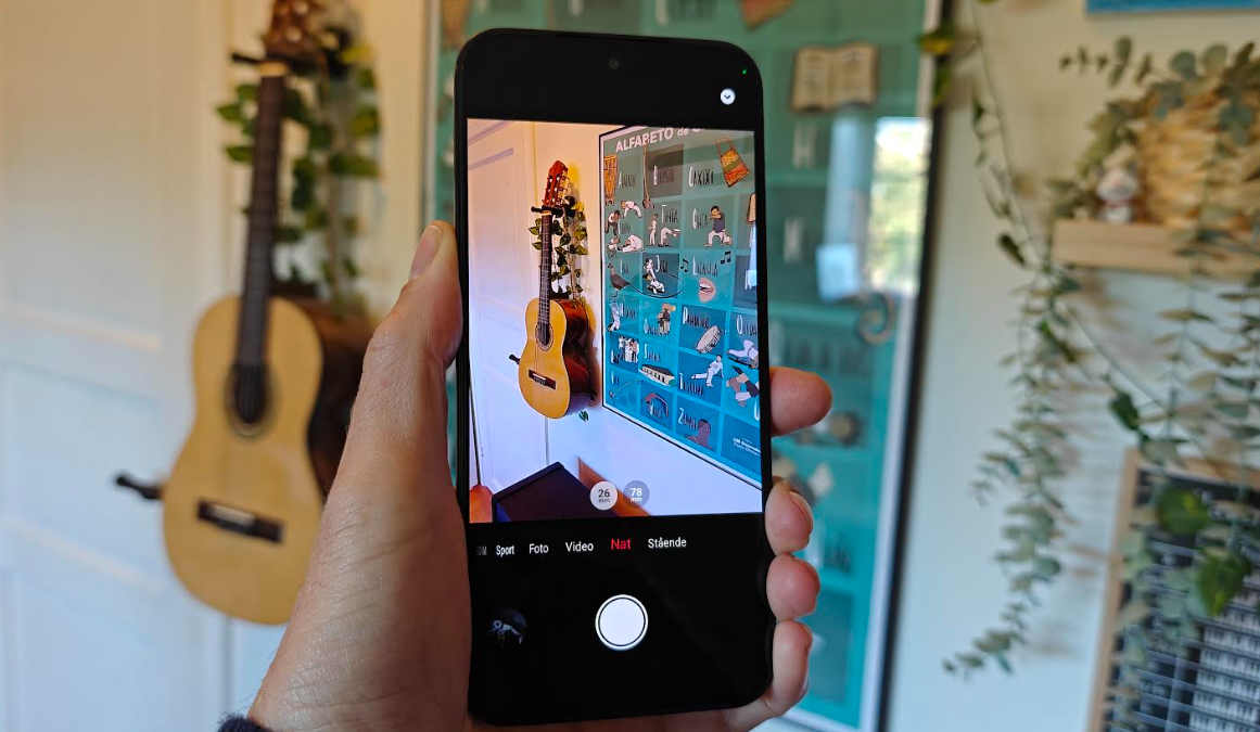Kameraet klarer almindelig brug fint, billeder i godt lys ser skarpe ud, og nattescener forbedres med AI-natfunktioner, selv om telefonen ikke når premium‐niveauet ved svært lys.