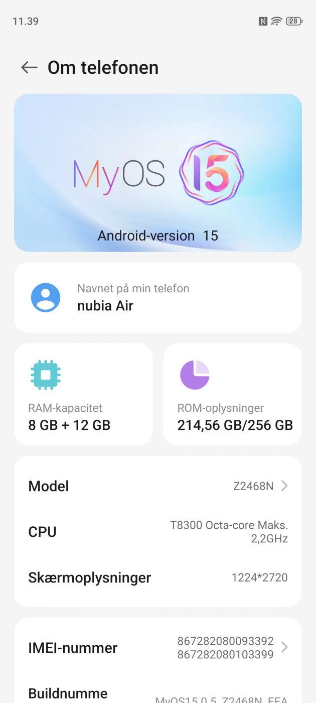 Nubia Air kommer med Android 15 ud af boksen og bruger Nubias eget interface (MyOS eller lignende), med en AI Performance Engine, der optimerer strømforbrug og appbrug.